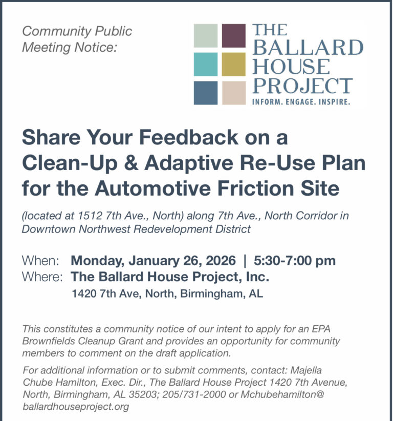 The Ballard House Project, Inc. (BH Project), seeks to preserve Birmingham’s African-American historic legacy and places. The organization hosts workshops, exhibits, and special events that educate children and adults while promoting awareness, dialogue, and a diverse community connection to its heritage and culture.